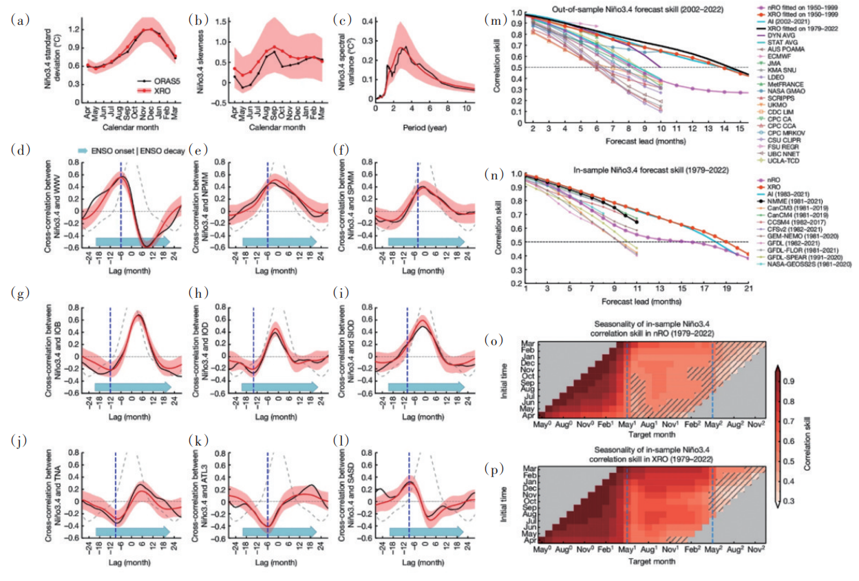 此外,机器学习方法在全球尺度的气候预测领域也有着亮眼的表现。来自University of Hawai‘i at Mānoa的Jin团队开发了一种扩展的非线性补给振荡器(XRO)模型,实现了对厄尔尼诺(ENSO)现象的精准预测。该研究发现,XRO模型在长达16~18个月的时间内提供了巧妙且可解释的预测(图11),并优于全球气候模型。
