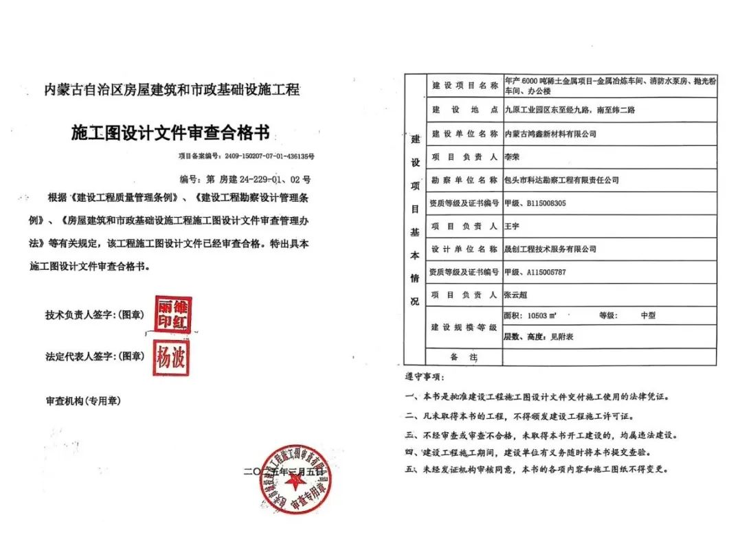 内蒙古鸿鑫新材料有限公司年产6000 吨稀土金属项目取得图审合格证