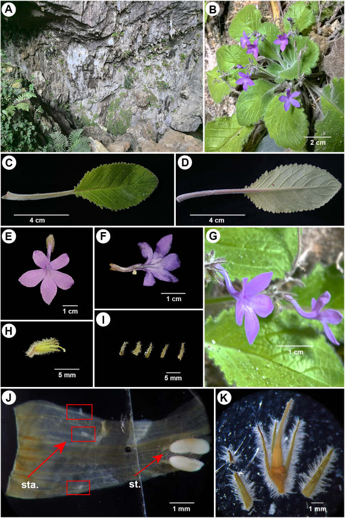据了解,弯管石山苣苔为多年生草本植物,花期为1至6月,目前仅分布于广西德保县龙光乡模式产地的溶洞石壁上,生长地海拔为454米。科研团队成员韦金鑫介绍,弯管石山苣苔在形态上与陆氏石山苣苔和细管石山苣苔较为相似,但具有以下特征:叶片为椭圆形至长圆状卵形,花冠具两条紫色纵条纹,子房呈圆锥形。依据世界自然保护联盟(IUCN)红色名录标准,其濒危等级初步评估为“极危”,主要依据为目前仅发现了一个种群,成熟个体约200株,分布面积狭小,且栖息地易受人类活动干扰。