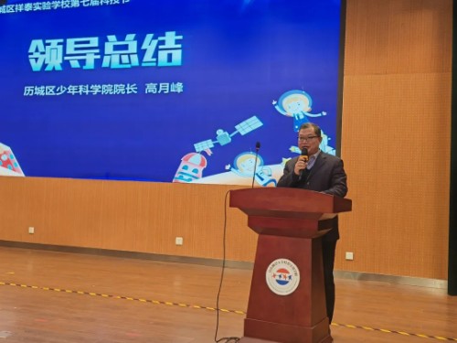 历城区少年科学院院长高月峰在致辞中为祥泰学子点亮科技月创新火种,提出对未来的期许:期待同学们在人工智能编程中解码未来密钥。他勉励青少年破除思维定式,以“初生牛犊敢破壁”的锐气,在跨学科融合实践中完成从科技爱好者到未来创变者的成长跃迁。