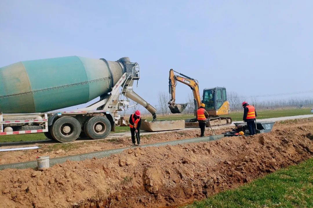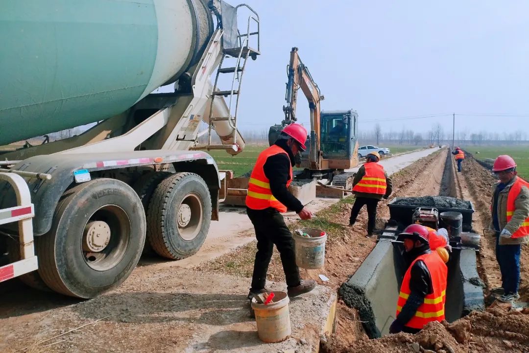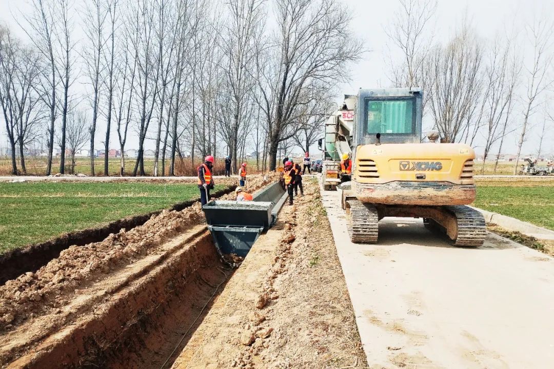 在项目六标段、七标段等施工现场,挖掘机、推土机等大型机械开足马力挖沟开槽、平整土方,施工人员紧张有序进行模板加固、钢筋捆扎、U型渠混凝土浇筑等作业,相关灌溉系统改造、田间道路修建等工程也在同步推进。