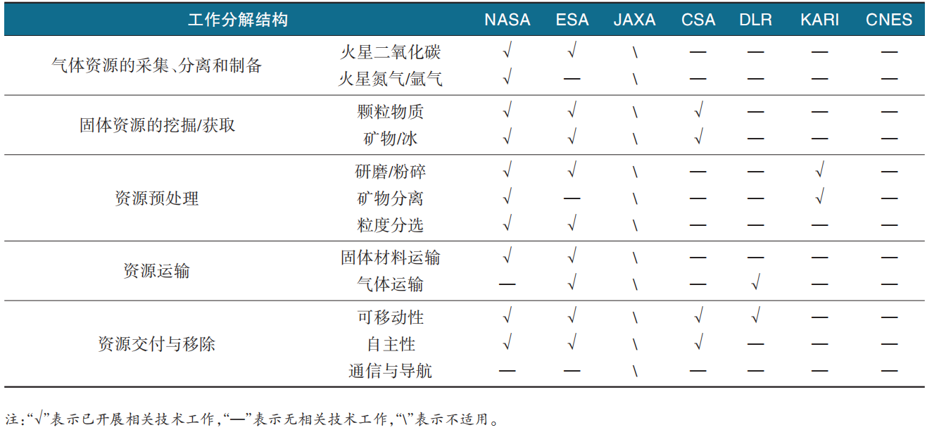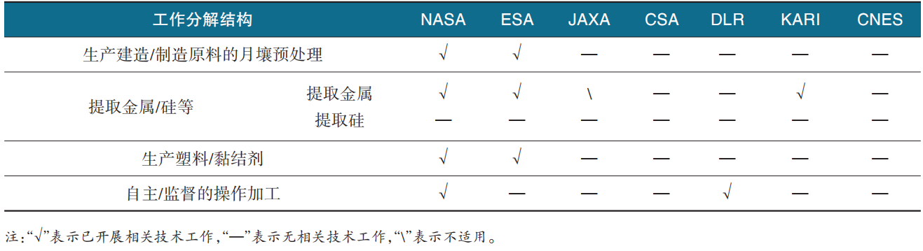 NASA与ESA在整体上对于ISRU价值链的研究较为系统、全面,尤其在原位资源采集与处理、资源加工、地外空间制造等领域,目前已具备多项相关且成熟度较高的ISRU技术与测试设备。此外,德国对于月面原位建造过程与技术的研究已形成一定体系,而加拿大则分别重点针对原位资源的表征与获取流程设计了不同的技术路线。