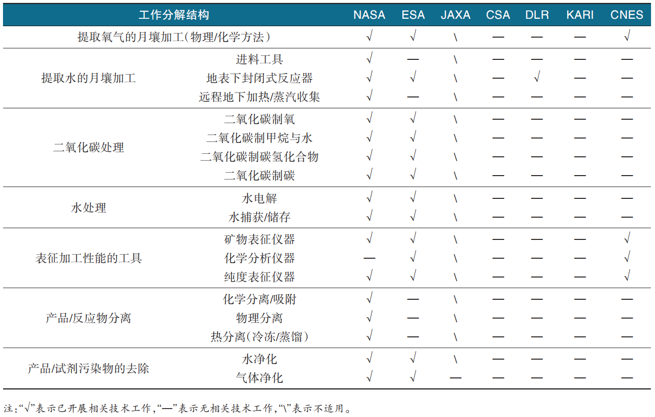 以NASA为首的各参与国的研究机构目前均在进行或计划进行多种ISRU技术的开发工作,尤其是在原位资源勘查评估、设备可移动性与自主性,加工月壤等原位资源以提取氧气、金属等应用领域已获得多项技术性突破。