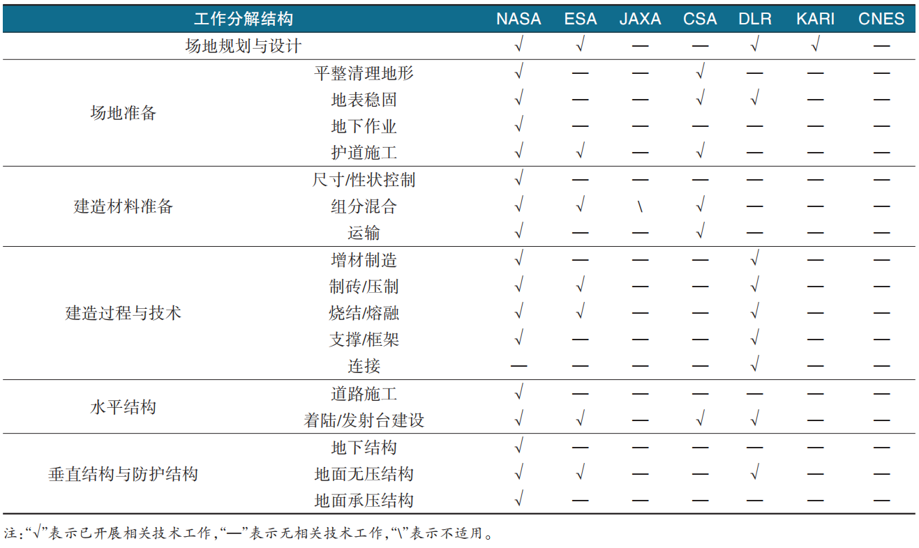 在成功研发出更多样的高性能材料前,月壤是最合适的用于地外场景下的建造和制造原料。评估生产建造和制造原料的资源加工往往与后续的月面原位建造领域、空间制造领域密不可分。还可从月壤中提取多种金属、黏结剂等材料作为原料用于建造和制造过程,此领域的差距评估结果如表7所示。NASA和ESA已开展了月壤预处理、提取金属与生产塑料等原料的研究。其他参与机构中仅有DLR和KARI分别对自主操作加工与提取金属两方面进行了一定的技术尝试。