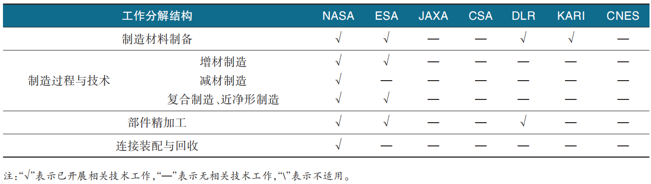 开展地外空间制造不仅能够最大限度地减少物流与备件存储量,还可大幅度降低地月往返运输过程中产生的风险。通常,月面原位建造和地外空间制造在技术、工艺、产品等方面的联系较为紧密。因此,针对ISRU的地外空间制造领域的评估内容与方法和月面原位建造领域类似,差距评估结果汇总于表9。地外空间制造领域目前还不是各参与机构针对ISRU研究的热点,多数机构仍处于探索如何制备用于空间制造材料的技术阶段。当前仅有NASA、ESA与DLR进行了空间制造流程中位于较后期的研究,如相关制造技术以及部件加工技术。在此之中,NASA的技术研究体系最为完整,已布局并实施了空间部件回收的技术研究。