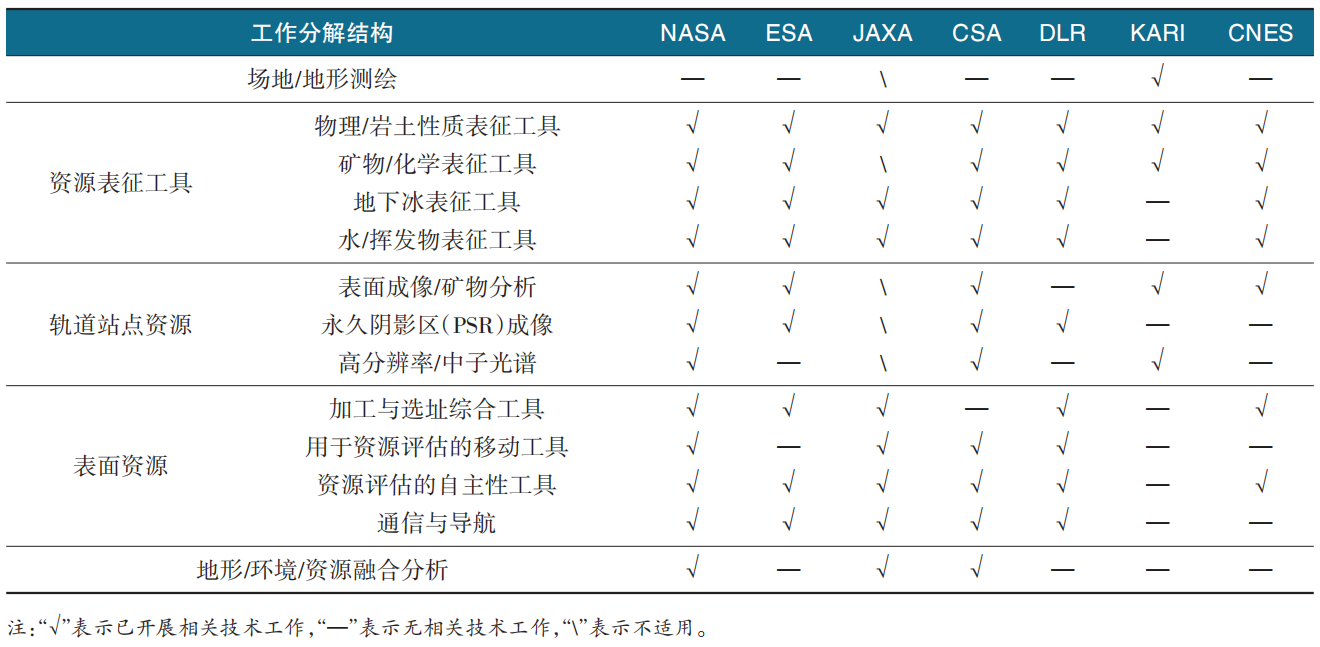 目前,NASA、ESA、CSA等各航天机构对原位资源勘查均开展了较为全面的研究。KARI在场地/地形测绘方面开展的技术研究是其区别于其他机构的一大特点与优势。