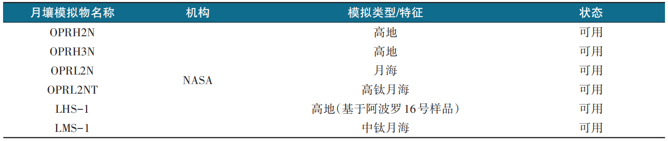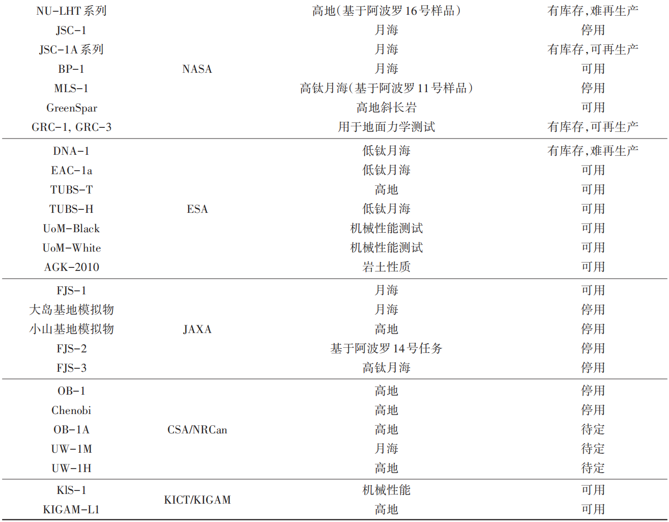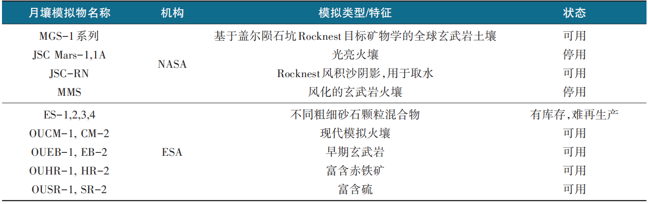 《差距评估报告》对各机构现有的星壤模拟物的库存状况与未来计划开发的潜在可能性进行了全面的评估。评估结果如表2、表3所示,针对每个国家/机构的各类星壤模拟物的模拟类型、特征、当前的4类状态进行了汇总整理。鉴于多种模拟物现阶段已处于不可用或难再生产状态,未来将需要更多种类和更高保真度的模拟星壤。尤其是针对位于如月球极地和高地的月壤模拟物研发,以此来支持后续ISRU能力的开发。此外,与模拟月壤相比,目前模拟火壤的研发仅有NASA与ESA2个机构开展了较为系统工作,且当前的研究仍处于模拟某单一性质(如矿物组分)的初步探索阶段。