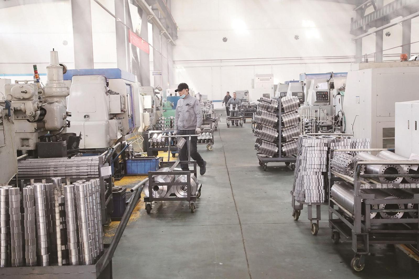 蓝光齿轮生产车间内,工人们正在加紧赶制订单。(摄影:李学飞)