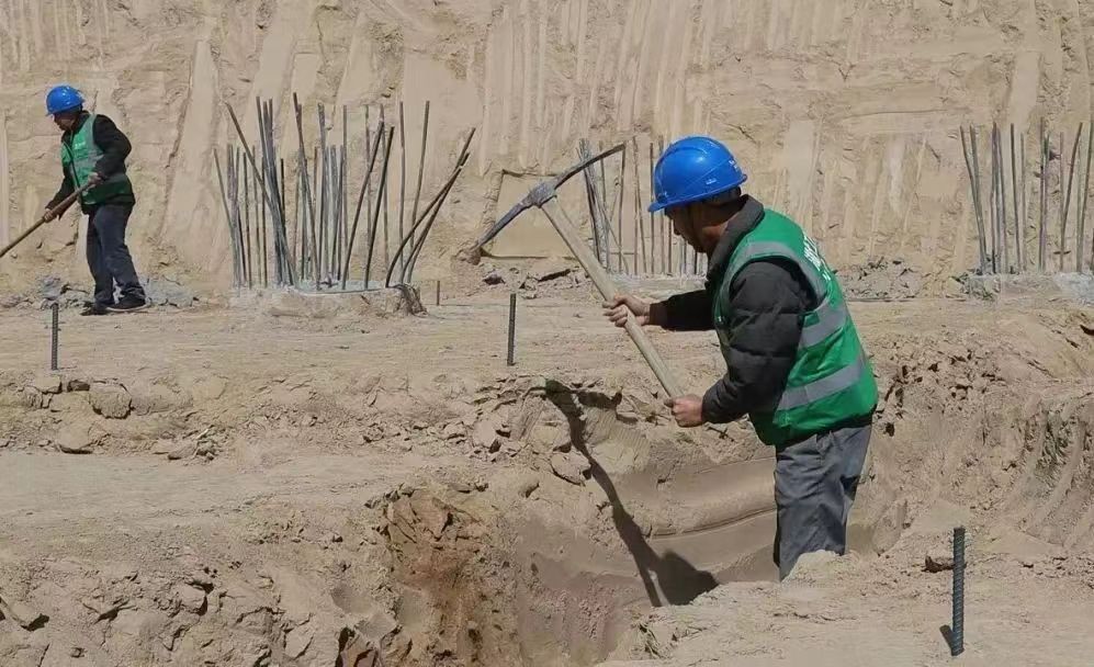 走进彭堡镇“宁湘直流”500MW集中式风电项目建设现场,施工人员正铆足干劲,进行风力发电机的基坑开挖和垫层工作,一派热火朝天的工作景象。