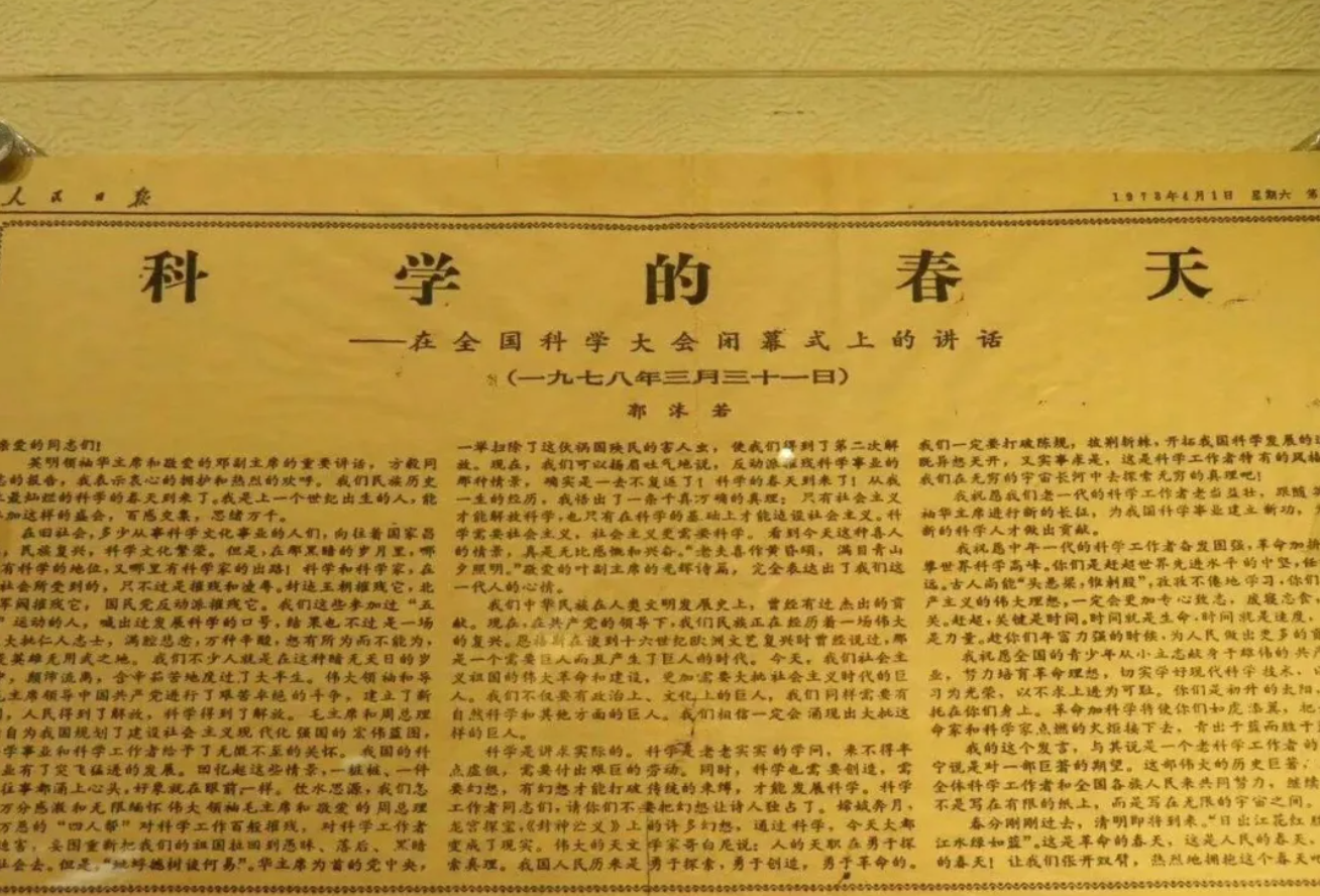 1978年3月31日,时任中国科学院院长郭沫若的书面讲话《科学的春天》,在全国科学大会闭幕式上宣读,诗一样的宣言不仅点燃了会场的激情,更象征着中国科技史翻开了新一页。