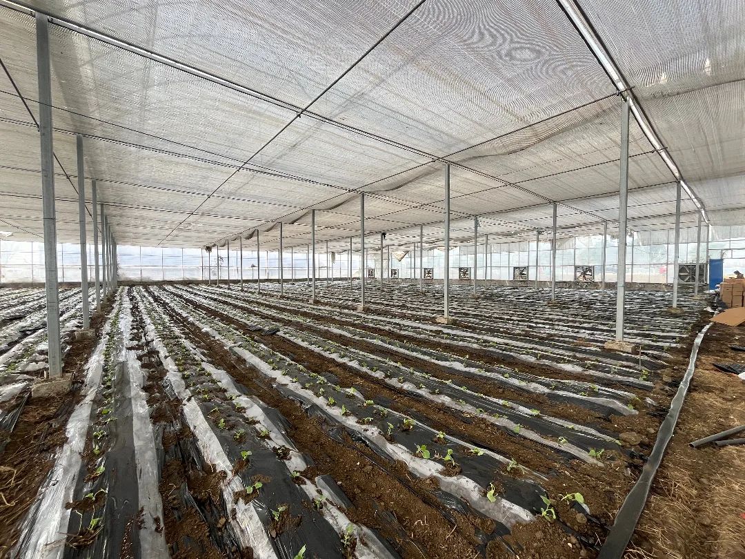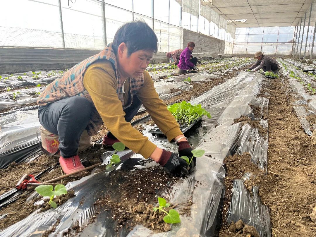 邢楼镇大堌村依托村集体飞地创业示范园,种植草莓、西瓜等经济作物,让土地产生更多效益,实现富民强村。在示范园温室大棚内,新栽植的蜜瓜苗茁壮成长,村民们正在精心管护蜜瓜苗。
