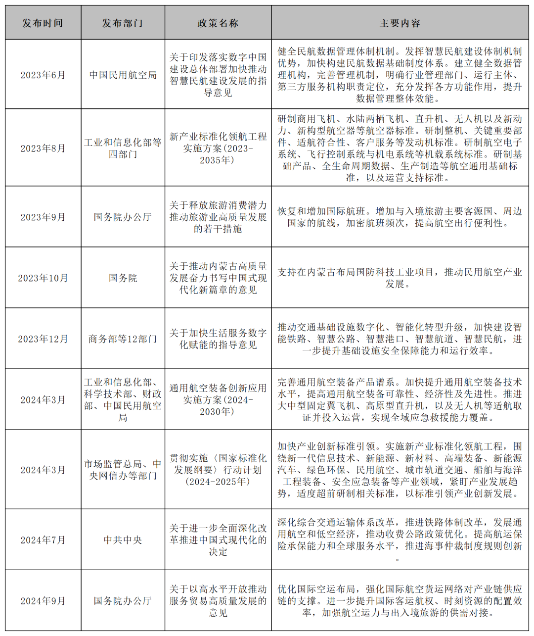 国家高度重视民用航空产业发展,陆续推出了一系列政策文件。工业和信息化部、科技部、国家能源局、国家标准化管理委员会发布 的《新产业标准化领航工程实施方案(2023-2035年)》提出研制商用飞机、水陆两栖飞机、直升机、无人机以及新动力、新构型航空 器等航空器标准;研制整机、关键重要部件、适航符合性、客户服务等发动机标准;研制航空电子系统、飞行控制系统与机电系统等 机载系统标准;研制基础产品、全生命周期数据、生产制造等航空通用基础标准,以及运营支持标准。表:近三年中央及地方关于民用航空领域政策脉络。