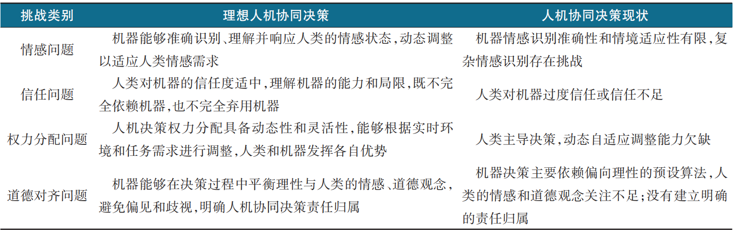 机器对人类价值观和道德的忽视主要是由机器理性决策的刻板印象导致的,如自动驾驶汽车的道德困境和面部识别系统的偏见问题。为解决这些问题,研究人员尝试将情感、道德等因素纳入机器学习模型,使用无偏见训练数据、更新算法等。在人机协同中道德责任归属是复杂的问题,不少学者呼吁出台相关新法律、明确法律框架,以确定人类和机器在不同情况下的责任。人机协同中的挑战现状如表1所示。