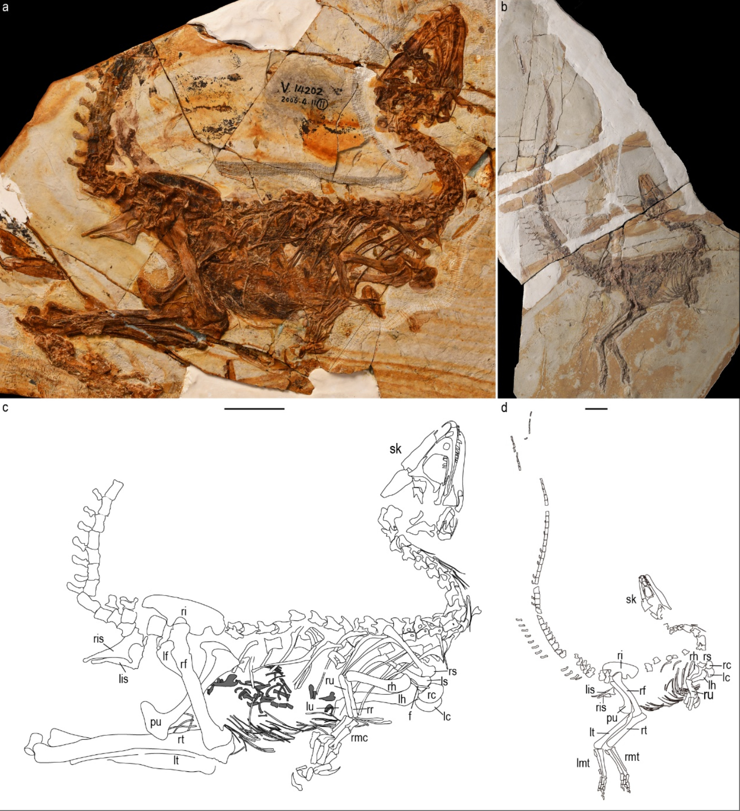 中国华诞龙(a, c)和凌源中华鸟龙(b, d)正型标本及线条图