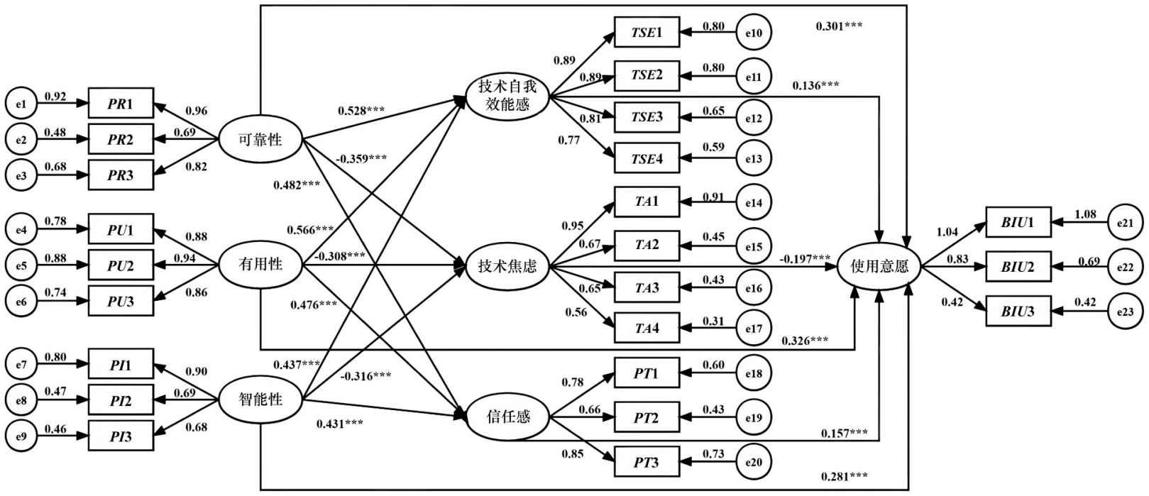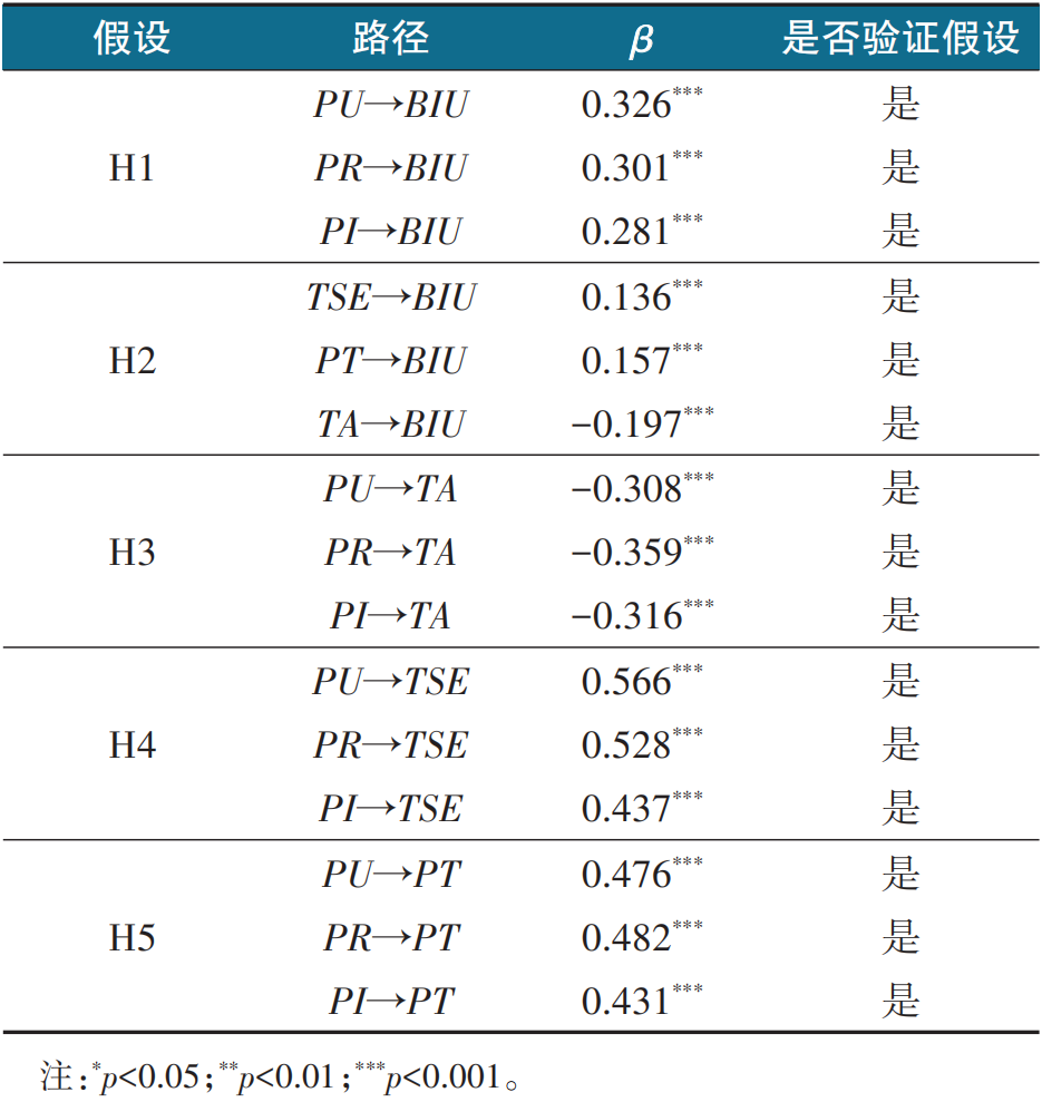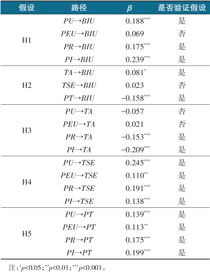 以感知有用性、感知易用性、感知可靠性和感知智能性作为知识的潜变量,技术焦虑、技术自我效能感和信任感作为中介变量,使用意愿为因变量建立结构方程模型,相关路径系数如表4。