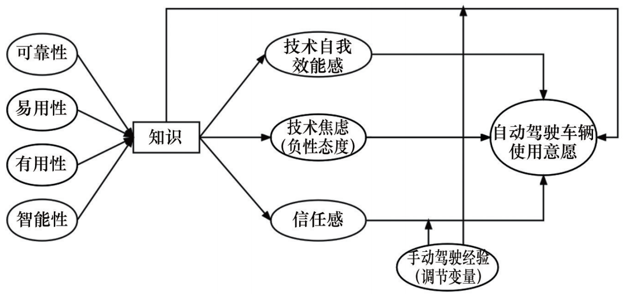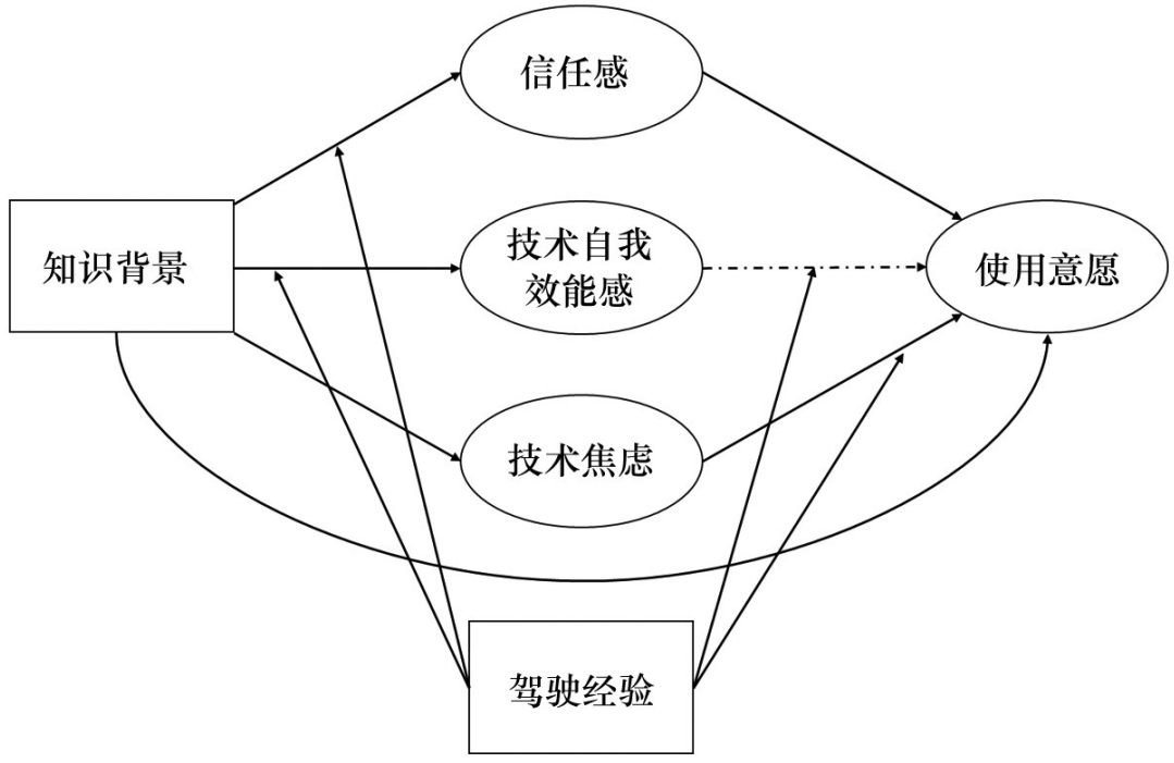 综合现有研究发现,技术焦虑、技术自我效能感和信任感均受到知识背景的影响,进而对使用意愿产生作用,而驾驶经验在其中可能起到一定的调节作用。然而,尚未有研究全面探讨并整合这些变量之间的相互作用路径。因此,本研究将在自动驾驶车辆的背景下,深入探究这一关系链,以期为自动驾驶技术的用户接受度提供更为全面的理论支持和实践指导。
