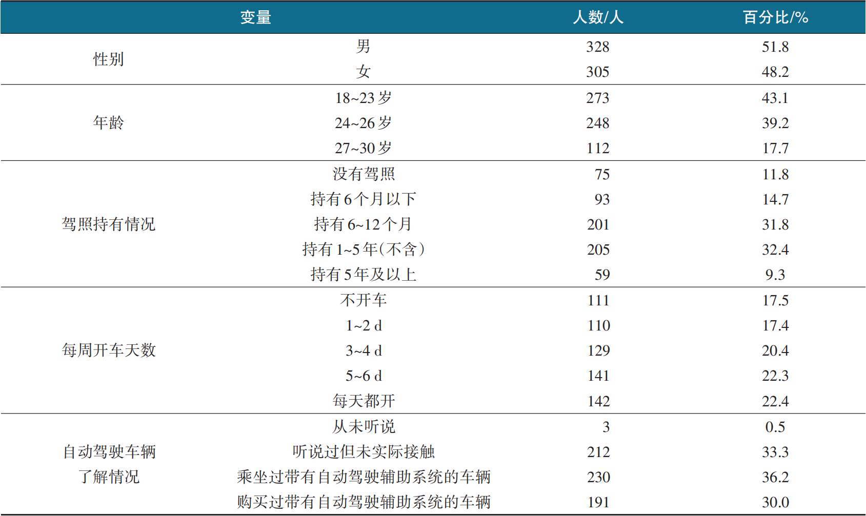 问卷回收完毕后,先筛除不符合要求的问卷。其次,使用SPSS 23.0将符合处理水平的问卷数据进行录入和整理,对样本基本信息特征进行描述性统计,并对观测变量进行因子分析和信效度检验,进行相关分析。然后,对数据进行正态化处理,使用AMOS软件构建结构方程模型,在完成模型拟合度检验后进行路径分析、结构效度分析和各变量间的关系检验,再检验各中介效应的显著情况。最后,采用SPSS Process检验驾驶经验在易用性和信任感对使用意愿影响中的调节作用,验证结构方程模型的有效性,以期建立起一个有调节的中介模型。