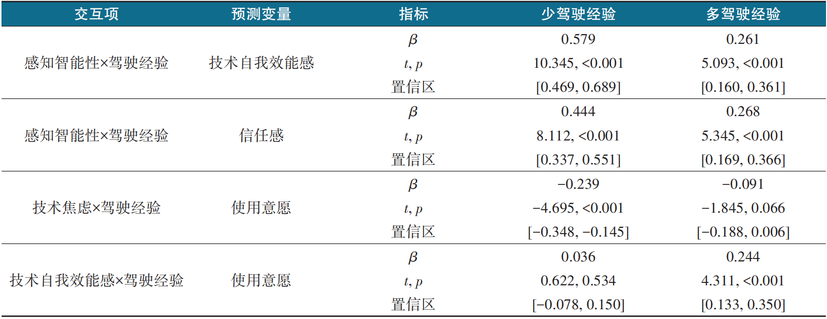 第三,在感知智能性的模型中,智能性显著正向预测使用意愿;显著负向预测技术焦虑;显著正向预测技术自我效能感;显著正向预测信任感。技术焦虑显著负向预测使用意愿;信任感显著正向预测使用意愿;技术自我效能感对使用意愿的预测不显著。驾驶经验与智能性的交互项显著负向预测技术自我效能感调节作用显著;显著负向预测信任感;但对使用意愿、技术焦虑的预测不显著。驾驶经验与技术焦虑正向显著预测使用意愿,但与信任感的交互项对使用意愿的预测不显著,见表9。