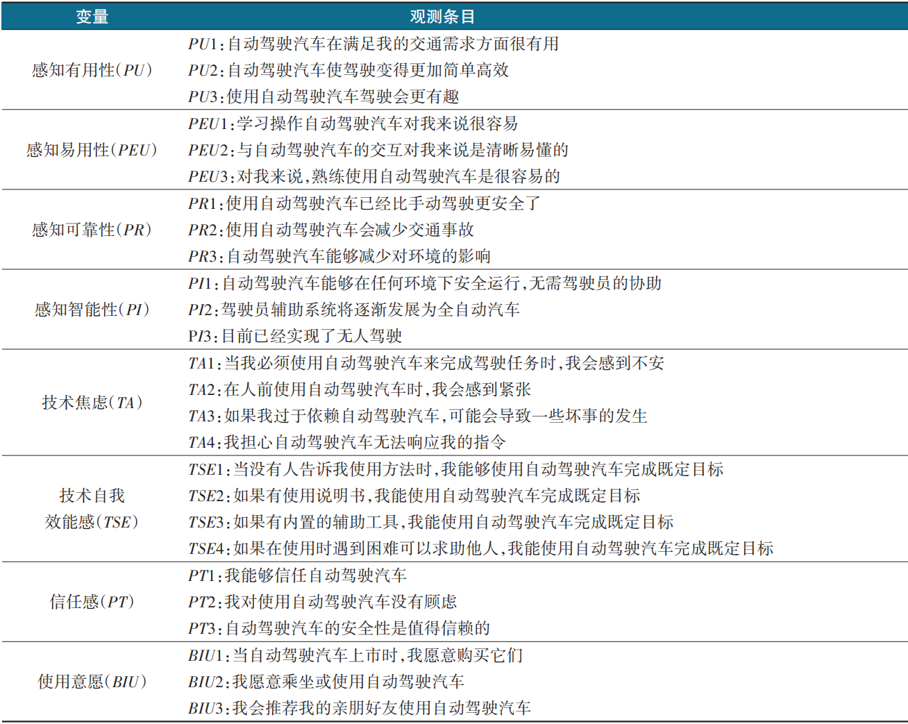 用户对于特定技术知识的深入了解,是其接纳并信任该技术的先决条件。因此,在自动驾驶技术日新月异、飞速发展的当下,其相关知识的普及却尚未能与技术创新的步伐同频。不同个体之间关于自动驾驶车辆的知识背景的差异显著,成为用户接受并信任该技术的一大障碍。目前,针对用户自动驾驶车辆知识背景的研究尚显不足,大多数研究者主要聚焦用户对某些具体知识的了解程度,或对知识类型的细化鲜有涉及。基于TAM的理念,综合一些文献中的研究要点,同时结合自动驾驶车辆的目前发展情况,将用户自动驾驶车辆的知识背景细化为以下几个维度。感知有用性(perceived usefulness):这涉及到用户认为自动驾驶车辆对其日常生活和工作绩效提高的有用程度。用户可能关心自动驾驶技术能否减少驾驶疲劳、提高出行效率、增加安全性等方面。感知易用性(perceived ease of use):这一维度反映了用户认为自动驾驶车辆使用的容易程度。用户可能担心技术操作的复杂性、界面的友好性及系统的响应速度等。感知可靠性(perceived reliability):用户对于自动驾驶车辆当前使用的安全和可靠程度的评估至关重要,可能关注自动驾驶系统的故障率、对突发情况的应对能力,以及在紧急状况下的安全性能。感知智能性(perceived intelligence):涉及到用户认为自动驾驶车辆的智能化程度。用户可能期待车辆具备高度智能的决策能力、环境感知能力,以及与其他车辆和交通系统的协同能力。