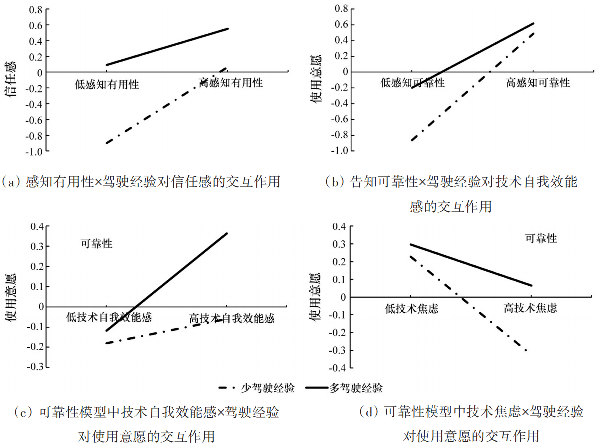 第二,在感知可靠性的模型中,可靠性显著正向预测使用意愿;显著负向预测技术焦虑);显著正向预测技术自我效能感;显著正向预测信任感。技术焦虑显著负向预测使用意愿;信任感显著正向预测使用意愿;技术自我效能感对使用意愿的预测不显著。驾驶经验与可靠性的交互项显著负向预测技术自我效能感;显著负向预测信任感;但对使用意愿、技术焦虑的预测不显著。驾驶经验与技术焦虑的交互项显著正向预测使用意愿,但与信任感、技术自我效能感的交互项对使用意愿的预测不显著,见表8。