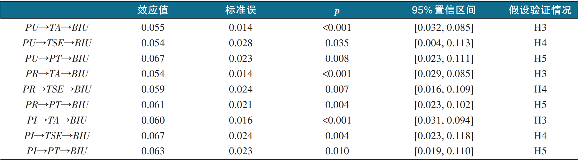 结果表明,有用性、可靠性和智能性维度知识背景均正向影响使用意愿,验证了H1;技术自我效能感和信任感对使用意愿有显著正向影响,技术焦虑对其有显著负向影响,验证了H2;有用性、可靠性和智能性知识背景均显著负向影响技术焦虑,正向影响技术自我效能感和信任感,验证了H3、H4和H5中的直接相关影响。基于此,采用Bootstrap法进行中介路径检验,在95%置信区间内进行5000次抽样,检验结果见表6,也验证了H3、H4、H5。