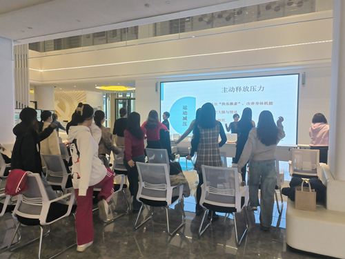 本次活动特邀济南心理卫生协会抑郁症非药物防治专委会牟青老师和济南心协音钵与健康研究中心赵立新老师担任讲师。牟青老师首先为大家介绍了压力对身体和心理的影响,并分享了多种简单易行的减压方式。赵立新老师带领大家体验了运动减压,在主动释放压力的运动中,释放“快乐激素”,唤醒身体细胞,激发身体活力。