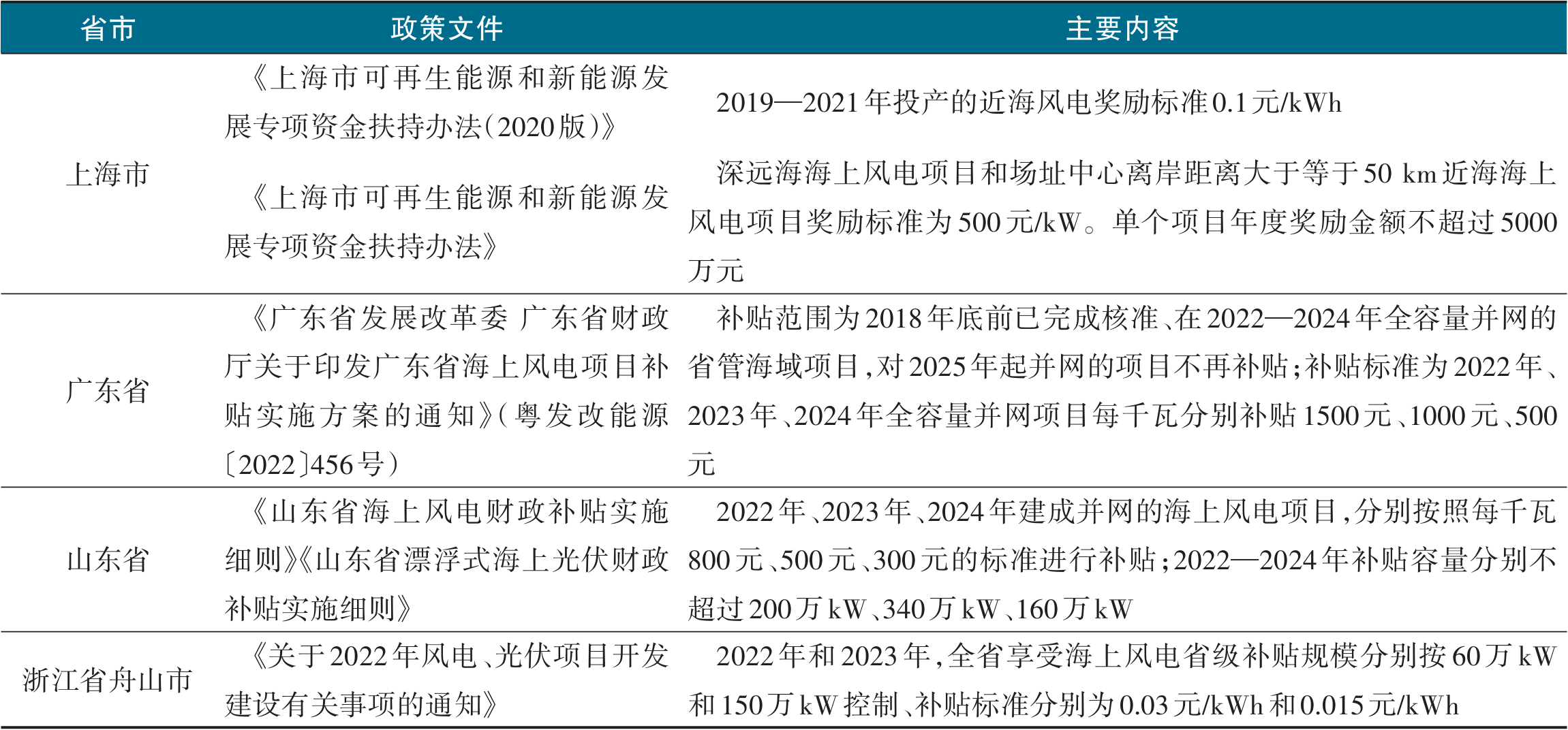 表2 各省市海上风电项目补贴政策