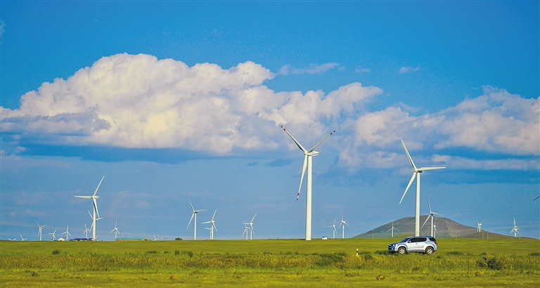 迎风转动的大风车是内蒙古草原随处可见的“风光”。