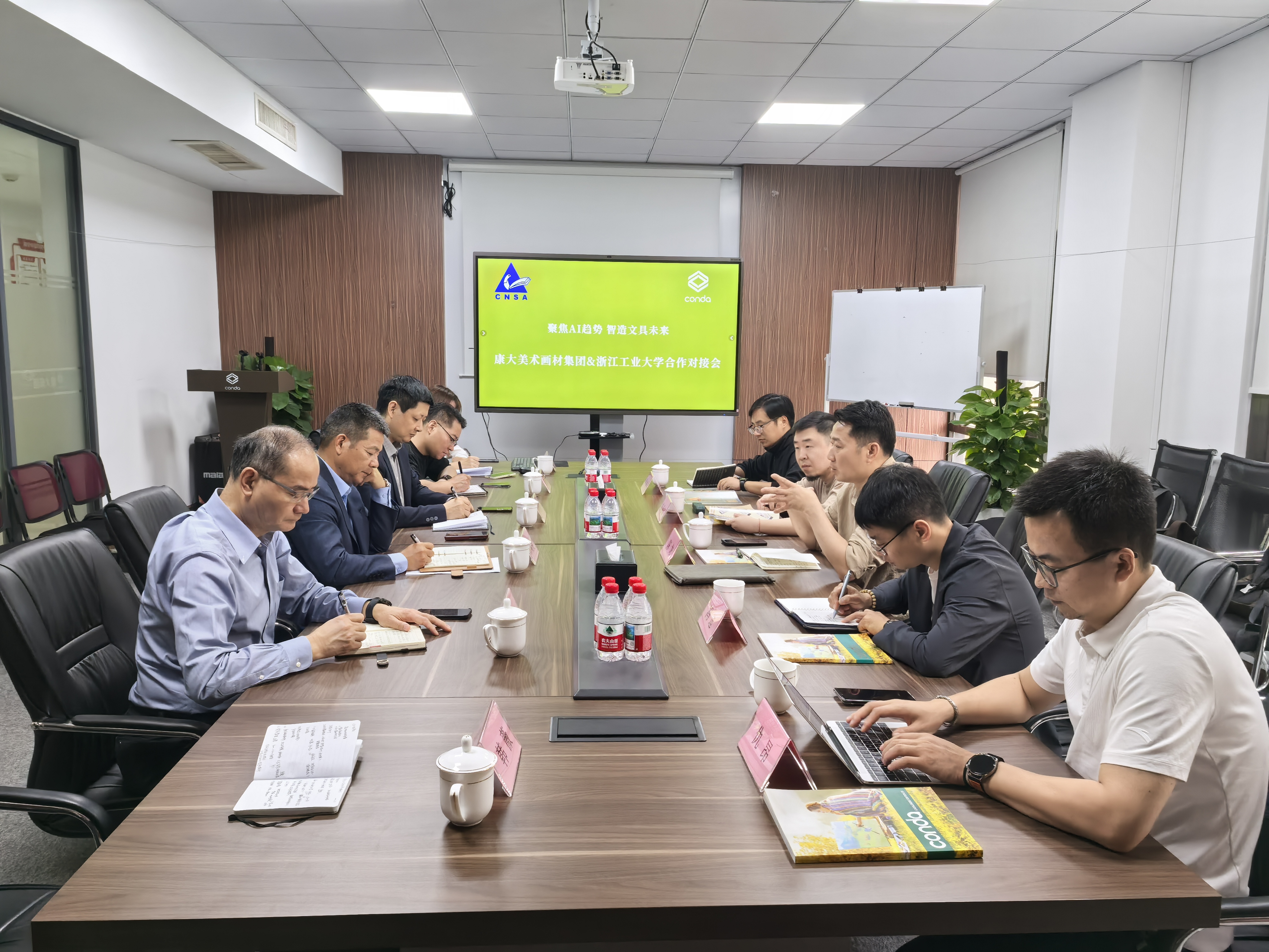 下午,在康大美术画材集团,陈龙一行参观了企业样品间,了解了企业基本情况。集团副总裁马展锋分析全球美术画材发展趋势和校企合作需求。协会理事长、集团董事长许观良希望浙工大整合设计学科优势,校企共建联合研发中心,推动传统美术用品向功能化、智能化、艺术化升级发展。