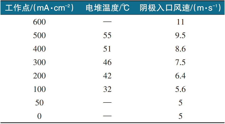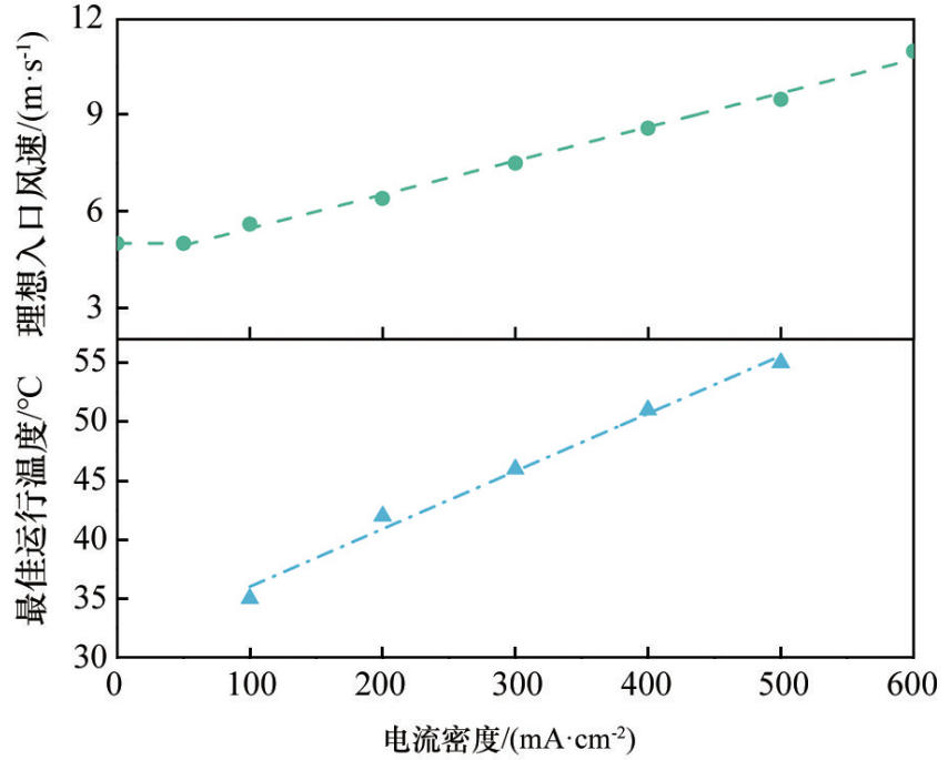 典型负载条件下空冷型燃料电池的最佳运行温度和对应的理想阴极入口风速如表2所示。