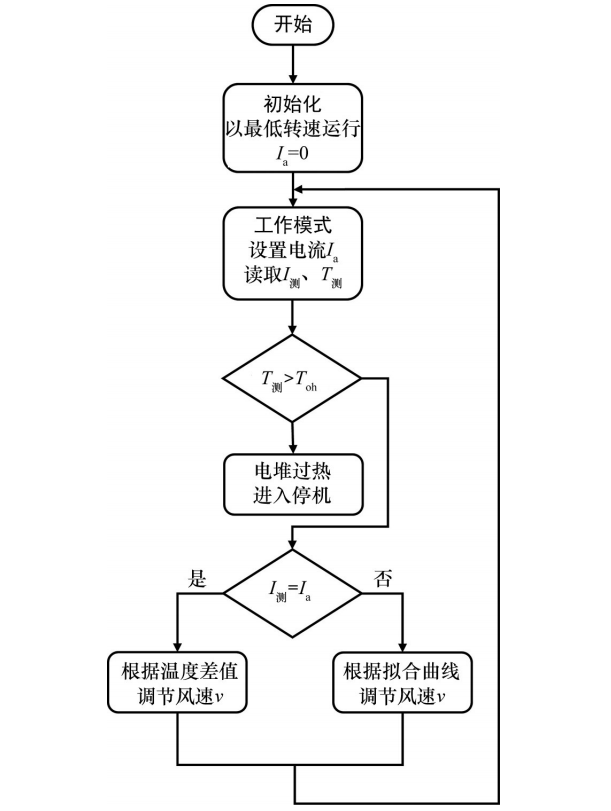 由于环境和电池本身的波动,空冷型燃料电池在某一负载电流下稳态运行时温度也是不断变化的,为了实现良好的温度控制,保证电池输出性能和稳定性,需要在电池运行中根据传感器测量结果实时反馈调整控制风扇输出功率,控制空冷型燃料电池温度稳定在最佳运行温度。本研究利用反馈调节的方法对稳态运行条件下的空冷型燃料电池进行温度调节控制,在变载时依靠预设的最佳入口风速快速响应,提高响应速度,减小超调量。具体的控制策略如图11所示,当检测电流I测不等于设置电流Ia时,根据拟合曲线调节风速;当I测=Ia时,则根据温度差值进行反馈调节。而Toh为电堆危险温度,认为是电堆已经脱离了热稳定状态,需要进入关机状态检修。