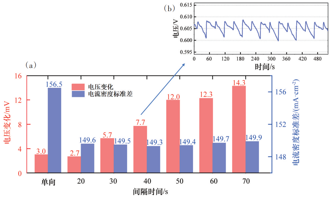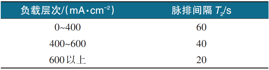 1)随脉排间隔时间增加,单电池输出电压在单个脉排周期内的衰减值逐渐上升,电流密度分布均匀性无明显变化。为保证较高的氢气利用率和较低的电压衰减值,在0~400 mA/cm2负载层次将脉排间隔时间设置为60 s,在400~600 mA/cm2负载层次设置为40 s,在600 mA/cm2以上设置为20 s。