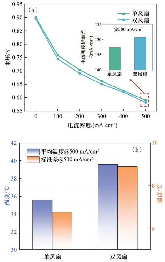 针对单风扇和双风扇配置的空冷型燃料电池开展实验分析,2种不同风扇配置下的空冷型燃料电池性能测试结果和500 mA/cm2下的温度测试结果如图9所示。实验结果表明,新的风扇组配置下,空气在阴极流道周期方向上分配更契合空冷型燃料电池需求,电池输出性能提高,同时500 mA/cm2时单电池内电流密度和温度的分布均匀性提高。此外,采用单风扇配置时,空冷型燃料电池平均温度也相对下降。这是因为在相同的风扇功率下,单风扇的设计为温度较高的中间区域提供了更高的风速,核心发热区域获得更充分的散热,因此平均温度降低。