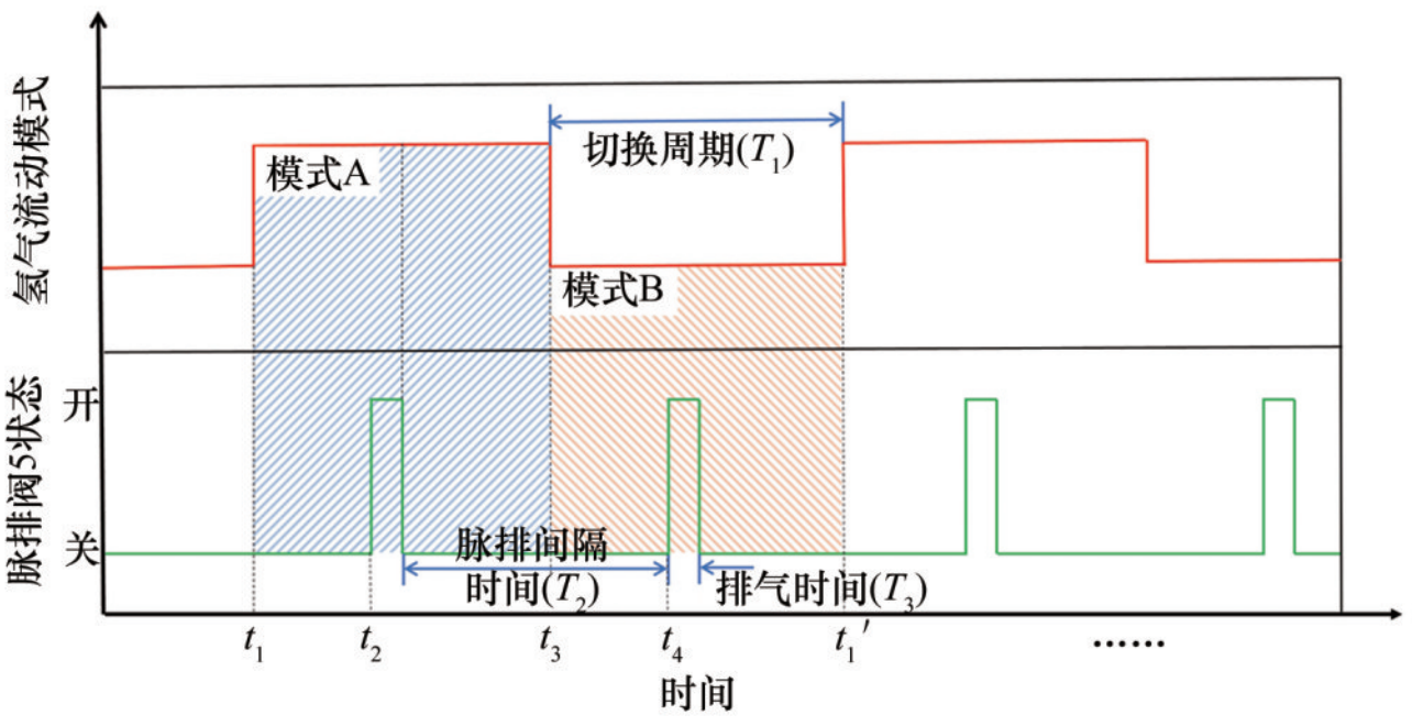 在设计氢气侧的控制策略时,关键参数包括氢气的流向切换周期T1、2次脉排之间的间隔时间T2以及每次脉排阀打开的持续时间T3。为了避免引起空冷型燃料电池系统的不稳定,同时确保氢气流向切换时刻与脉冲排放阀的开启时刻不会互相冲突,将氢气流向切换周期T1设定为脉排间隔T2与排气时间T3之和,并将氢气流向的切换时刻设置在两次脉排阀打开的间隔期内。图3为具体时序图,从t1时刻开始,系统以模式A运行。在运行T1/2-T3到t2时刻时,脉排阀开启T3时间后关闭。完成排气后,此时在模式A状态下已运行T1/2时间。随后,系统继续运行T1/2时间至t3时刻,使模式A运行总时间达到T1。然后在t3时刻,通过控制进气电磁阀组将氢气流动模式切换至模式B,实现氢气的反向流动。相同于模式A的控制方式,在运行T1/2-T3时间后,到t4时刻时打开脉排阀T3时间进行排气,随后继续运行T1/2时间至t1'时刻,使模式B运行总时间达到T1。从t1至t1'时刻为2个完整的模式A、B切换周期,此后以相同方式控制模式的切换和脉排阀的开闭,循环往复运行,交替实现氢气流向的改变和流道积水的排出。