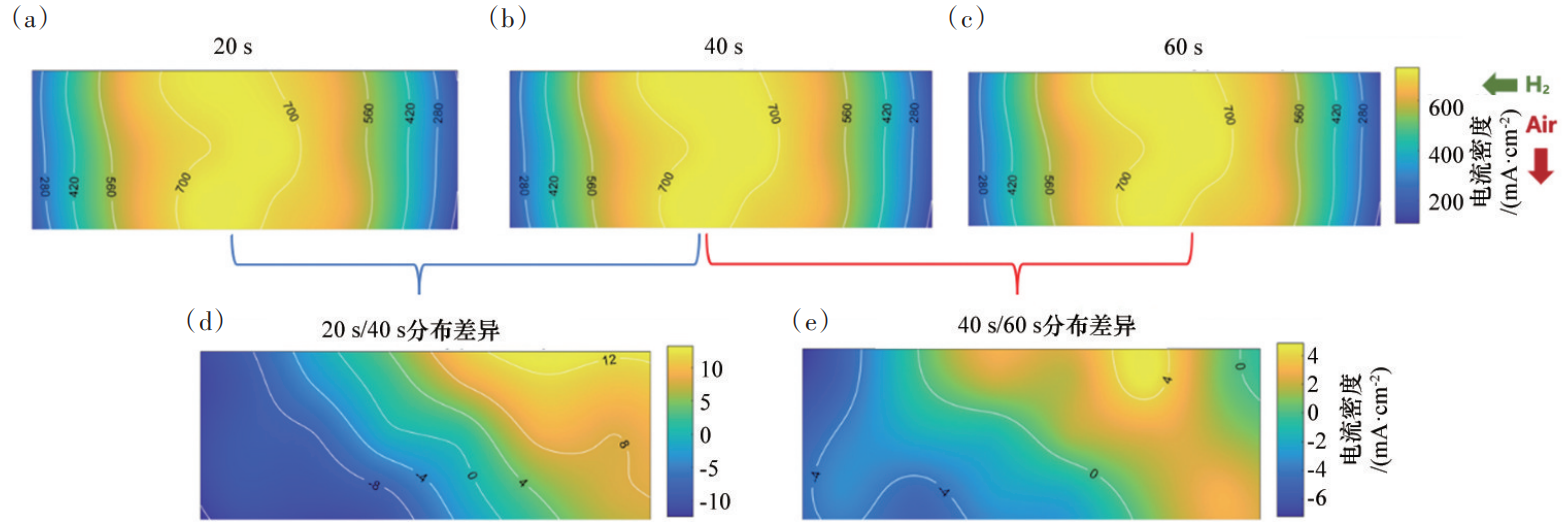 使用原位测试实验平台对负载电流密度为500 mA/cm2时不同脉排间隔时间T2下的电流密度分布情况进行测试,测试结果如图6所示。实验结果表明,双向供气结构下,由于液态水不会积聚在某一端,电流密度分布在不同脉排间隔时间下基本一致,脉排间隔时间20 s和40 s之间的差异稍大于40 s和60 s之间的差异,但整体相互差异较小。