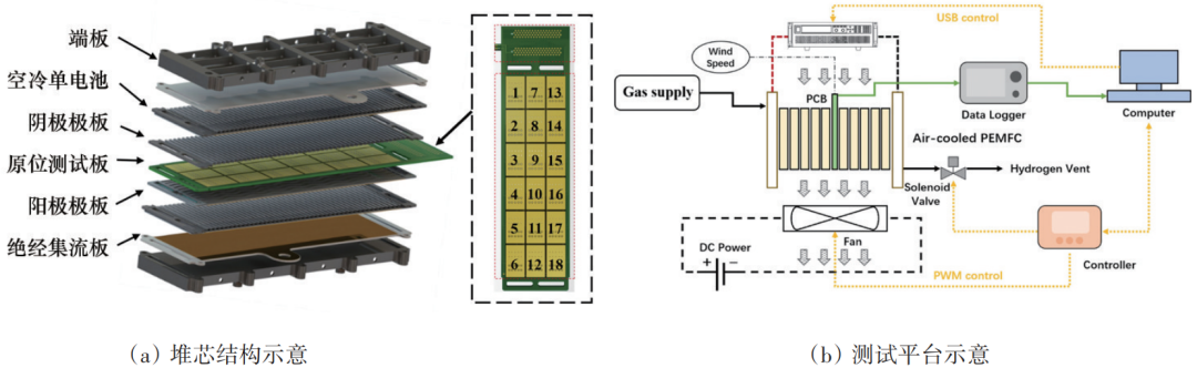 对空冷型燃料电池来说,风速变化会同时影响电池的空气计量比、工作温度和质子膜湿度,多种因素相互耦合,风速过高或过低都会影响电池的输出性能。此外,空冷型燃料电池内温度分布不均匀,不仅不利于电池性能,还会导致局部热应力和热点,造成电池失效等严重后果。设计优化的阴极风扇组和风扇转速控制方法对于提高电池性能、均匀性和寿命至关重要。