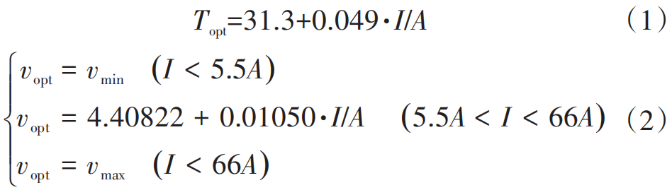 利用数据拟合建立一个以空冷型燃料电池负载电流I为自变量的电堆最优运行温度和阴极入口风速的函数关系,得到函数关系如式(1)和式(2)所示