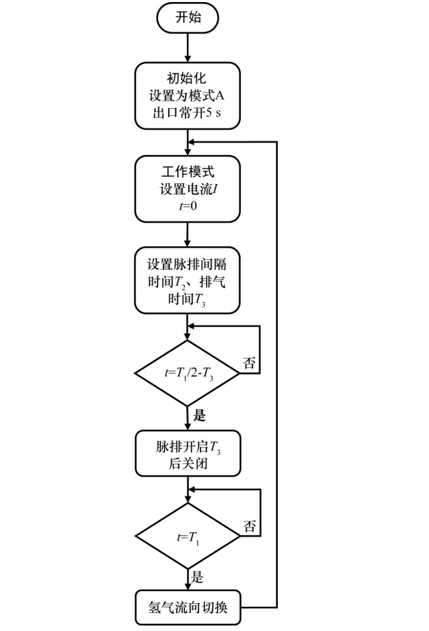 综合本节研究结果,生成空冷型燃料电池氢气控制策略,如图8所示,开始运行前先将电磁阀设置为模式A的状态,并打开脉排阀用氢气吹扫5 s后切换至工作模式。设置负载电流后开始计时,然后设置脉排间隔时间T2和排气时间T3,并计算T1=T2+T3。当运行T2/2-T3时间后,脉排阀开启进行排气,T3后关闭。随后继续运行T1/2直至达到t=T1时刻,调整电磁阀开闭状态,切换为模式B,随后以相同策略循环。