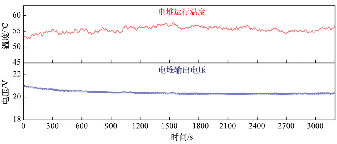 对空冷型燃料电池系统开展运行稳定性测试,在电流密度为500 mA/cm2的情况下持续运行1 h。实验过程中系统输出电压与电堆温度测试结果如图13所示。测试开始前,电堆初始温度为53.1℃,单电池平均电压为0.657 V。测试开始后10 min内,由于电池内部水热状态还未达到平衡状态,电堆输出电压出现持续衰减,单电池平均电压降低至0.642 V;10 min后直至测试结束的过程中,输出电压基本保持不变,单电池平均电压从0.642 V变为持续运行1 h后的0.637 V,波动范围相对于平均测量结果不到1%,运行稳定性良好。