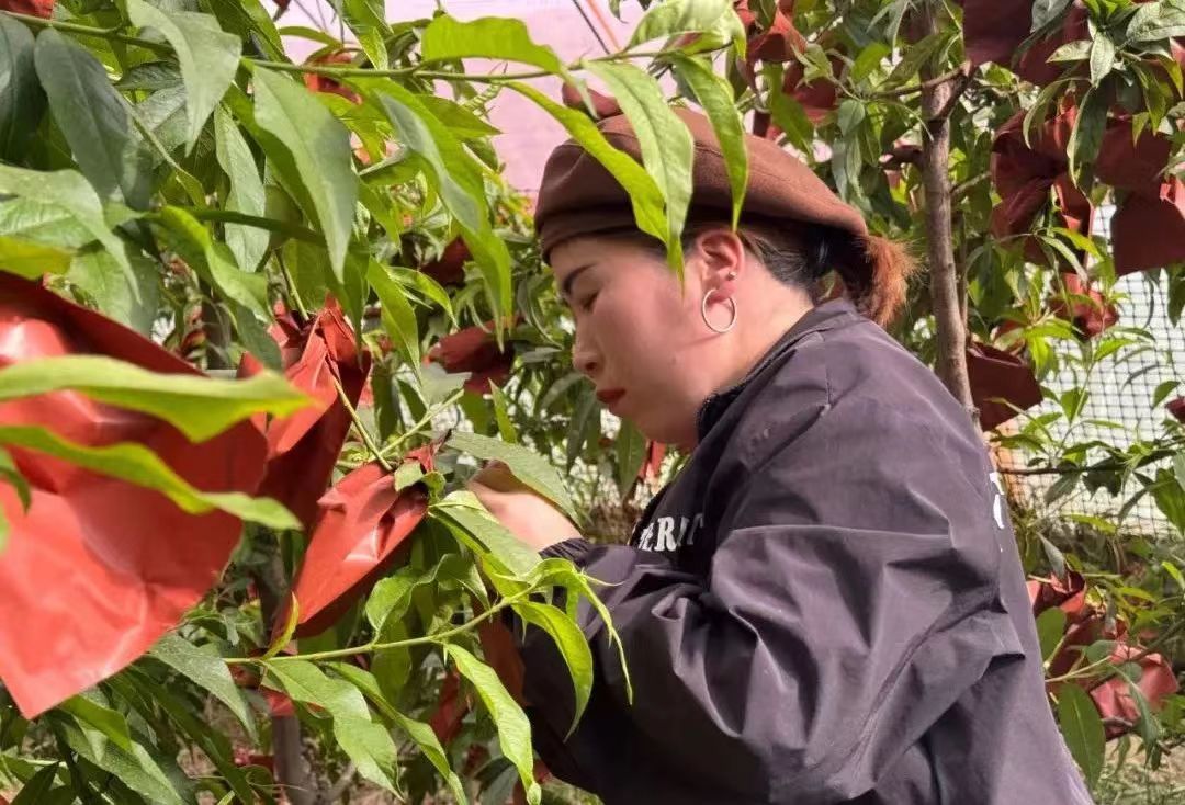 “疏果时,得挑果形端正的留下,每根枝条留2到3个果最合适,这样养分能集中供应,桃子才能长得又大又好。套袋就好比给蟠桃‘穿新衣’,不仅能有效抵御病虫害、防止鸟儿啄食,还能减少农药残留,让桃子的果皮更加光滑美观。”村民马奋梅一边介绍,一边动作娴熟地操作着。