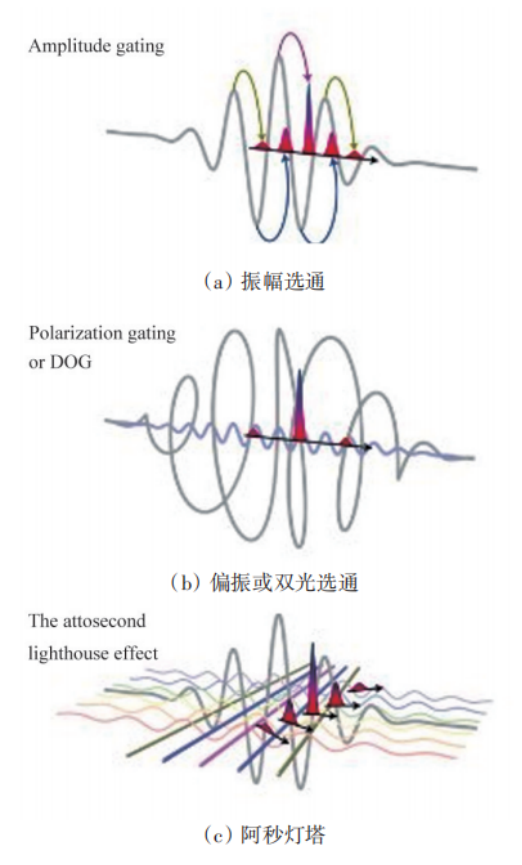 驱动激光的每半个光周期会产生一次高次谐波,这些高次谐波彼此干涉,在频域上表现为一系列梳齿状的光谱,对应在时域上表现为阿秒脉冲的序列,称为阿秒脉冲串。阿秒泵浦-探测实验通常需要使用孤立阿秒脉冲,即通过合适的选通方法,从阿秒脉冲序列中选出单个脉冲,常用的几种选通方式如图2所示。