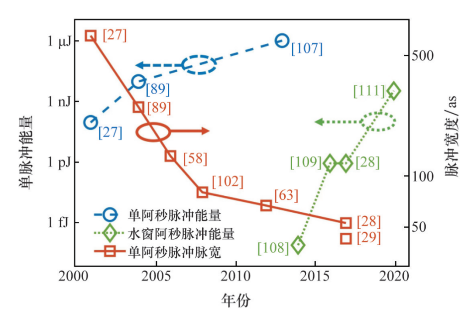 图3 最短单阿秒脉冲(红色实线)、最高单阿秒脉冲能量(蓝色虚线)、最高水窗波段阿秒脉冲能量(绿色点线)的发展历史