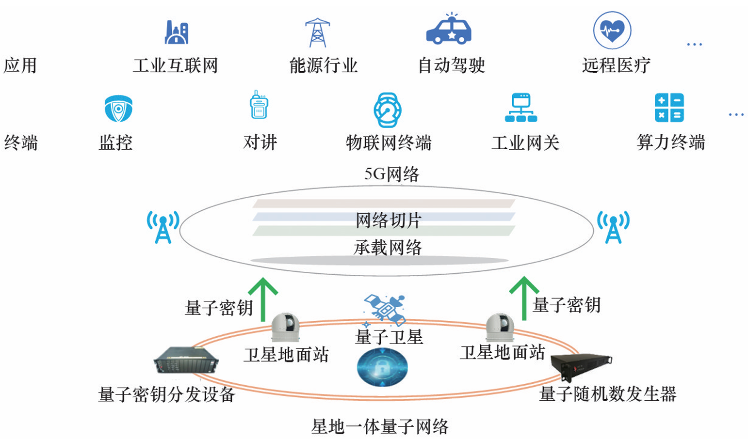 得益于国家的前瞻部署和长期支持,国科量子通信网络有限公司在全球率先初步建成了星地一体广域量子保密通信骨干网络,具备全球量子密钥投送能力。网络成码率、可用性、可运营性等关键指标均处于全球领先地位,这为量子保密通信与5G技术的融合提供了条件和可能(图1)。