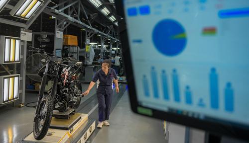 位于巴南区的重庆宗申机车工业制造有限公司,高端摩托车生产数字化车间的一显示屏显示着车间生产信息。