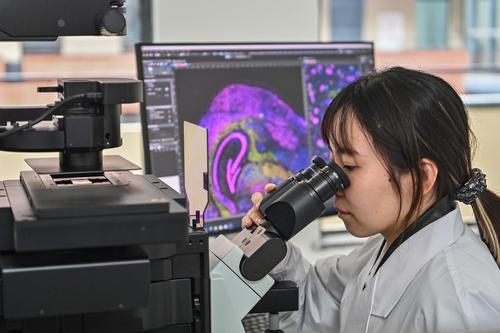 西部(重庆)科学城金凤实验室,科研人员正在激光共聚焦显微成像室做实验。