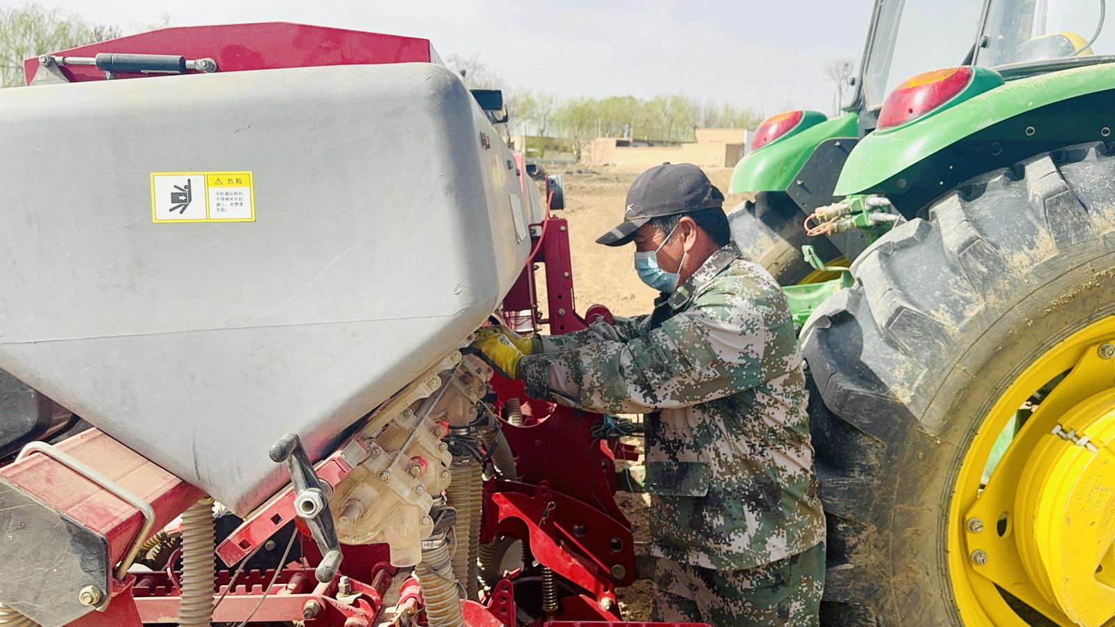 万众农业机械化服务有限公司的技术人员正在调整农机设备。