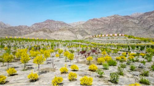4月22日,平罗县崇岗镇贺兰山东麓黄屯子生态修复治理工程项目区花草树木发芽生长。近年来,平罗县聚焦贺兰山生态环境修复,先后实施贺兰山东麓黄屯子生态修复治理工程、西线高速生态修复项目等,按照适地适树、乔灌结合、“以水定绿”的思路,大力推进生态建设,开展分片包植增绿行动,目前累计完成生态修复面积3万余亩,栽植各类苗木79.4万株。