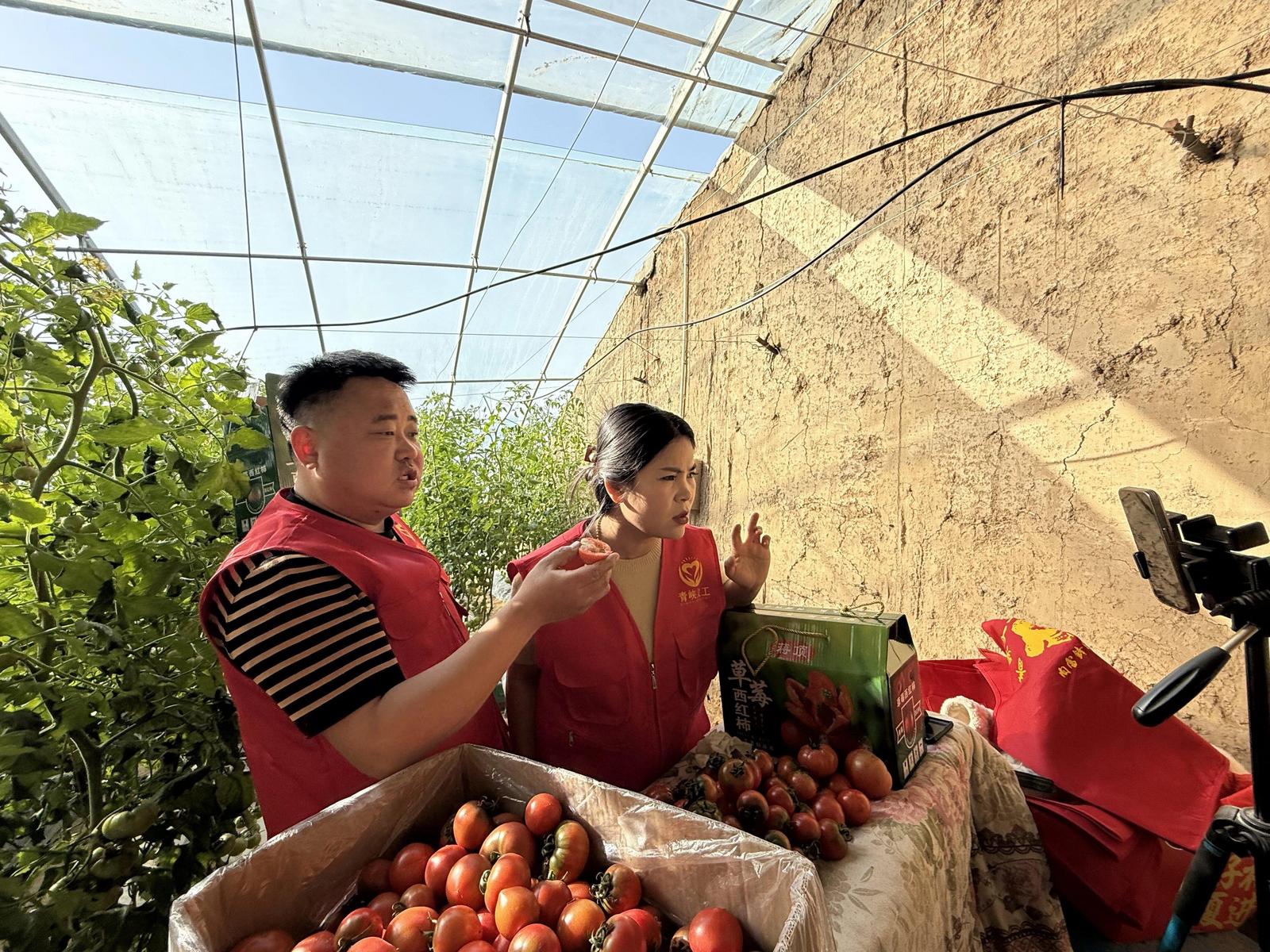 “前两年,我家西红柿熟透了卖不出去,烂在地里,愁坏了。”青铜峡市瞿靖镇蒋顶村村民王多志感慨地说,“今年,多亏网络人才直播带货,没想到他们一开播,一会儿工夫,西红柿全卖光了。”走进蒋顶村西红柿大棚,青铜峡市自媒体协会电商人才同步开展助农直播带货,原本滞销的西红柿、草莓,1小时便全部售罄。打通农产品通往消费者餐桌“最后一公里”,为乡村振兴插上“数字翅膀”。
