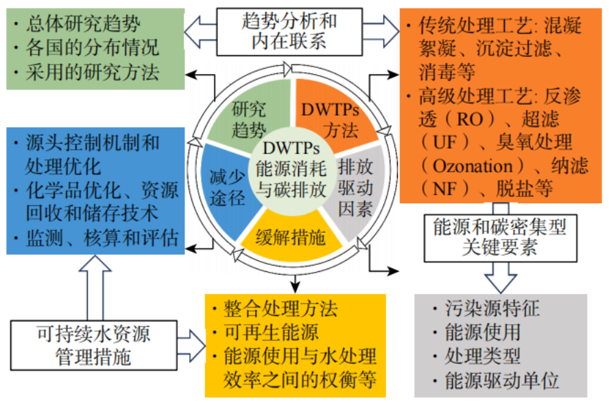 生物离子交换(BIEX)工艺通过吸附、离子交换及生物作用去除水中污染物,树脂吸附保留作用延长污染物停留时间,为生物降解提供了条件。树脂上生物膜展现良好的生物活性和丰富的菌群结构,对污染物降解效果显著。饮用水处理能耗和碳排放取决于水量、水质及处理要求等,将传统能源与可再生能源耦合使用,是缓解传统能源消耗和污染物去除的有力方式(图4)。膜系统作为能源密集过程,会产生大量的碳排放。若优化能源输送系统可节省高达20%的能源消耗并有效去除污染物。此外,借助人工智能(AI)系统,对工艺流程和多目标控制进行系统化梳理和优化,能提高处理效率。