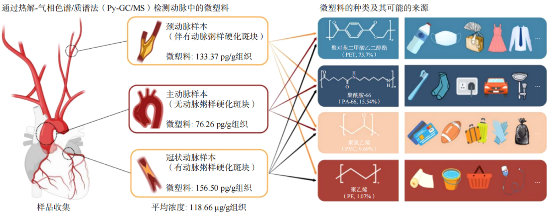 图3 不同动脉样本中检测到的微塑料含量及塑料种类与可能来源